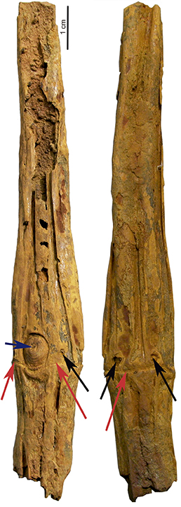 Caule incompleto de Chimonobambusa manipurensis, bambu fóssil recentemente encontrado na Índia, procedente de camadas com cerca de 37,4 mil anos. As setas pretas indicam marcas de espinhos, as vermelhas, um nó bem marcado e típico dos bambus, e a azul escuro, uma gema nodal